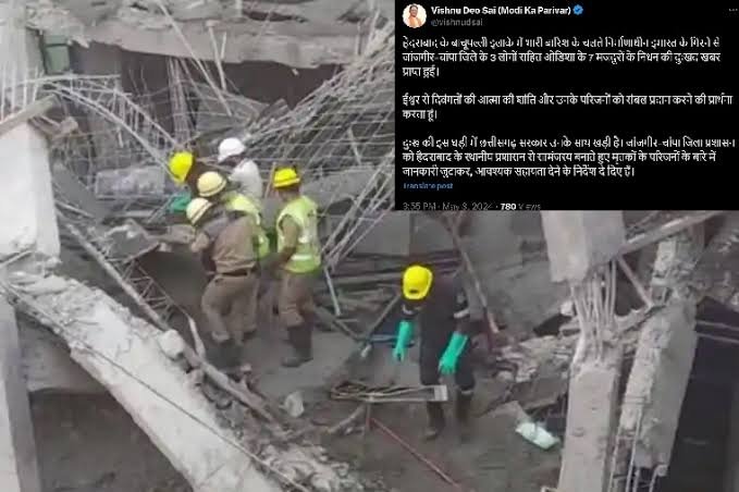 मुख्यमंत्री साय ने अपने सोशल मीडिया हैंडल X पर लिखा है कि हैदराबाद के बाचूपल्ली इलाके में भारी बारिश के चलते निर्माणाधीन इमारत के गिरने से जांजगीर-चांपा जिले के 3 लोगों सहित ओडिशा के 7 मजदूरों के निधन की दुःखद खबर प्राप्त हुई. ईश्वर से दिवंगतों की आत्मा की शांति और उनके परिजनों को संबल प्रदान करने की प्रार्थना करता हूं.
