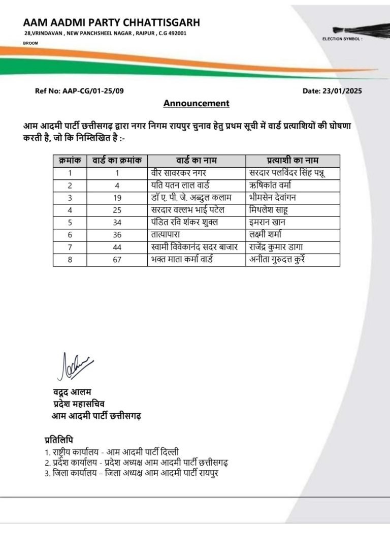 आम आदमी पार्टी ने जारी की प्रथम सूची, रायपुर, दुर्ग और बिलासपुर सहित इन जिलों में उतारे प्रत्याशी