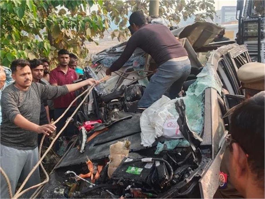 कंटेनर से टक्कर के बाद कार के उड़े परखच्चे, सीट से चिपक गए शव… 5 की मौके पर मौत