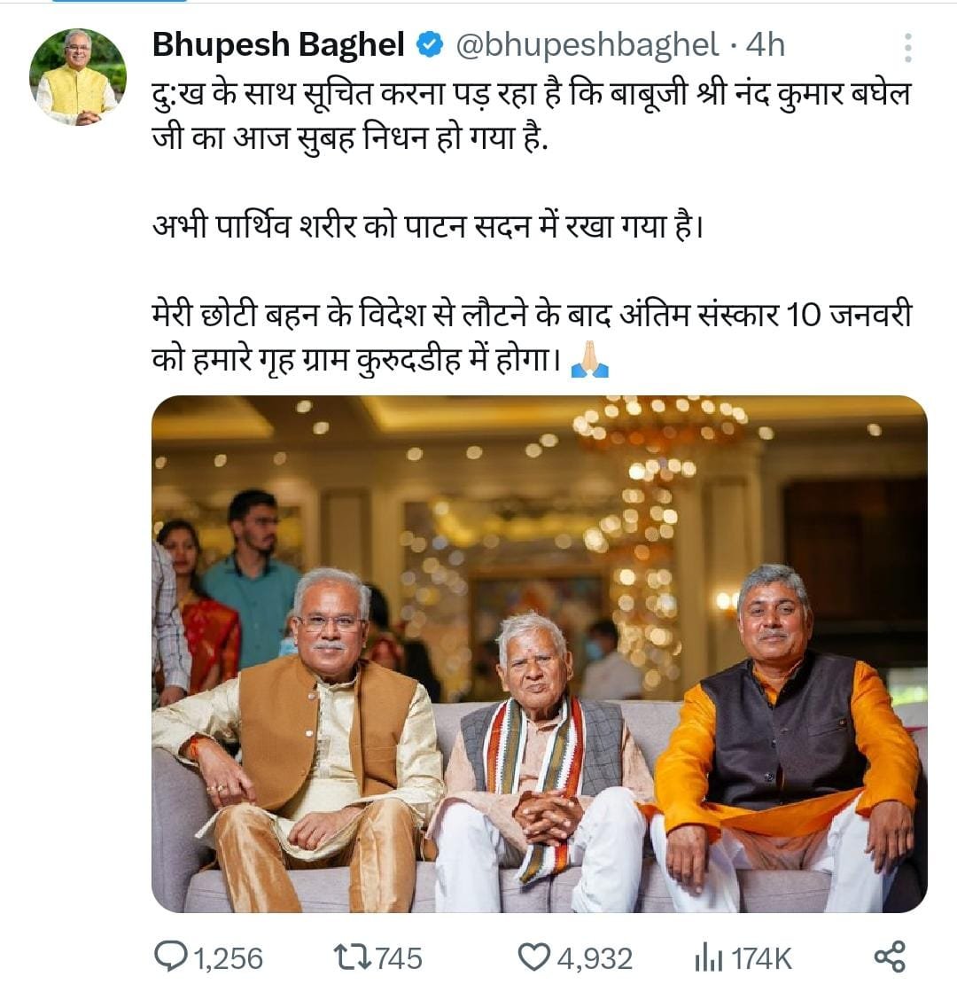 पूर्व मुख्यमंत्री भूपेश बघेल कई दिनों से अपने पिताजी की देखभाल में व्यस्त थे। वे लगभग प्रतिदिन अस्पताल जाकर उनका हाल-चाल जान रहे थे। श्री बघेल की माता जी का कुछ साल पहले ही निधन हो गया था और अब पिता श्री का चला जाना उनके जीवन की अपूरणीय क्षति है।