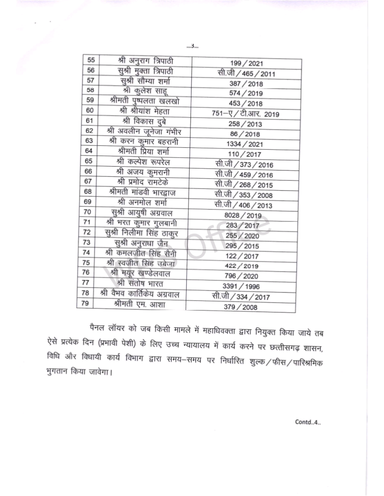 रायपुर : राज्य शासन द्वारा बिलासपुर उच्च न्यायालय में 79 पैनल अधिवक्ताओं की नियुक्ति