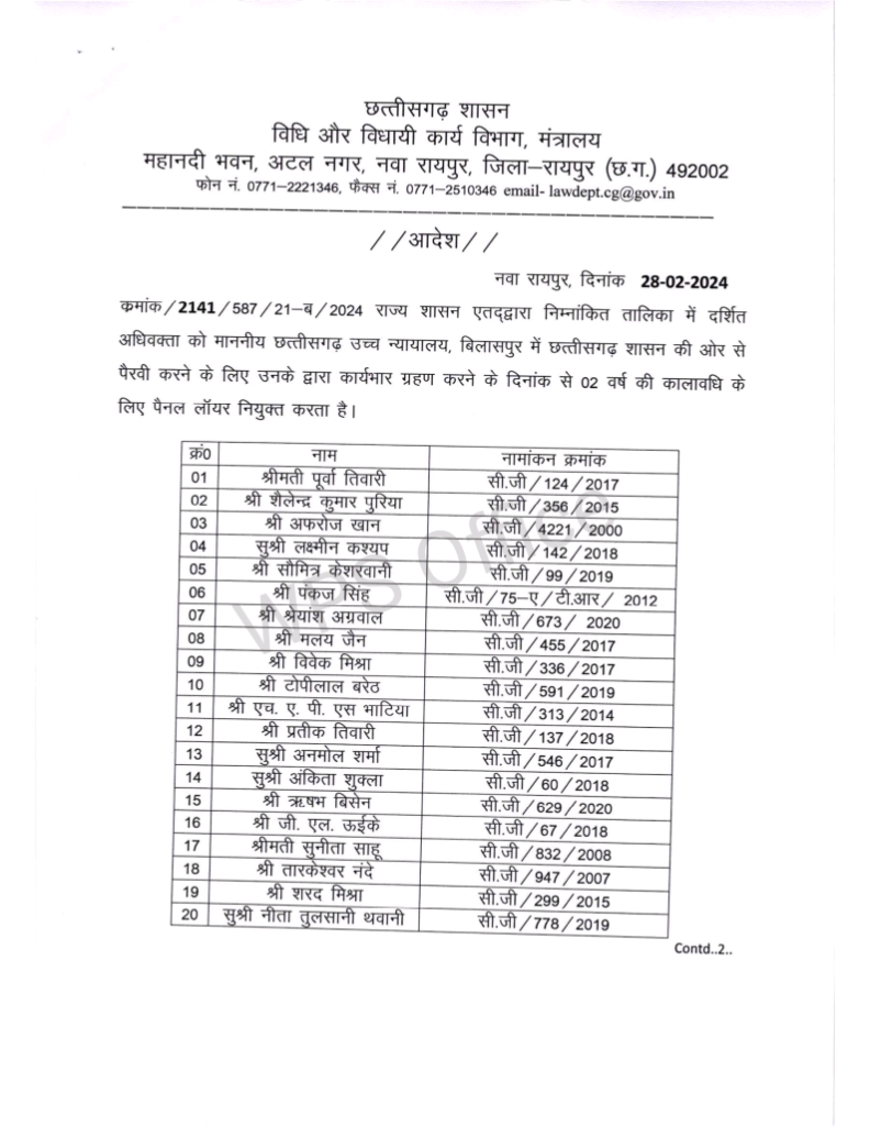 राज्य शासन के विधि एवं विधाई कार्य विभाग द्वारा छत्तीसगढ़ उच्च न्यायालय, बिलासपुर में शासन की ओर से पैरवी करने के लिए 79 पैनल अधिवक्ताओं की नियुक्ति की गई है। विभाग द्वारा नियुक्त इन पैनल अधिवक्ताओं का कार्यकाल दो वर्ष का होगा।