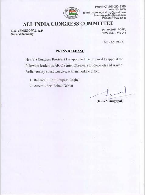 रायपुर। अखिल भारतीय कांग्रेस कमेटी के महासचिव के.सी. वेणुगोपाल ने कांग्रेस के राष्ट्रीय अध्यक्ष मल्लिकार्जुन खडग़े के निर्देश पर रायबरेली और अमेठी संसदीय क्षेत्र में एआईसीसी के वरिष्ठ पर्यवेक्षकों की नियुक्त की है। जिसमें छत्तीसगढ़ के पूर्व मुख्यमंत्री भूपेश बघेल को रायबरेली और राजस्थान के पूर्व मुख्यमंत्री अशोक गहलोत को अमेठी का वरिष्ठ पर्यवेक्षक बनाया गया है। रायबरेली लोकसभा सीट से राहुल गांधी और अमेठी से केएल शर्मा चुनाव लड़ रहे हैं।