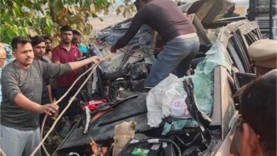 कंटेनर से टक्कर के बाद कार के उड़े परखच्चे, सीट से चिपक गए शव… 5 की मौके पर मौत