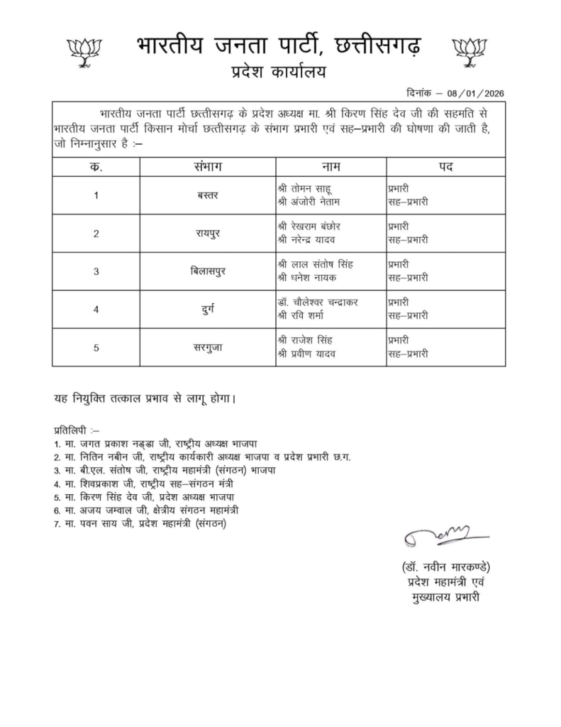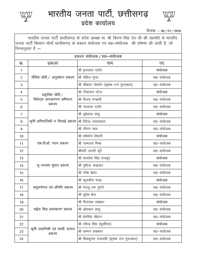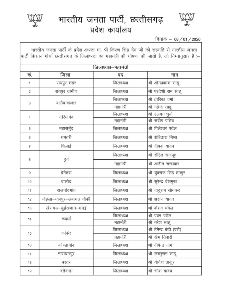 CG Politics : भाजपा किसान मोर्चा में नए पदाधिकारियों की नियुक्ति, देखें किसे मिली जिम्मेदारी…!!