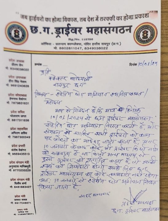 और संगठन में शामिल सभी ड्राइवर को काम में लौटने आदेश जारी करता है. अगर 10 जनवरी के बाद कोई भी ड्राइवर किसी गाड़ी को रुकवाता है या किसी अन्य माध्यम से दूसरे ड्राइवर को प्रताड़ित करता है. तो इसकी स्वयं की जिम्मेदारी होगी. इसके के लिए छत्तीसगढ़ ड्राइवर संघ का कोई जिम्मेदारी नहीं रहेगा.