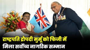 रायपुर।  फिजी के सर्वोच्च नागरिक सम्मान मिलने पर राष्ट्रपति द्रौपदी मुर्मु को सीएम विष्णु देव साय ने बधाई और शुभकामनाएं दी है। सीएम ने अपने सोशल मीडिया साइट एक्स पर लिखा ​है कि राष्ट्रपति द्रौपदी मुर्मु को फिजी के सर्वोच्च नागरिक सम्मान ‘Companion of the Order of Fiji’ से विभूषित होने पर हार्दिक बधाई एवं शुभकामनाएं। यह हम सभी भारतवासियों के लिए गौरवशाली क्षण है।