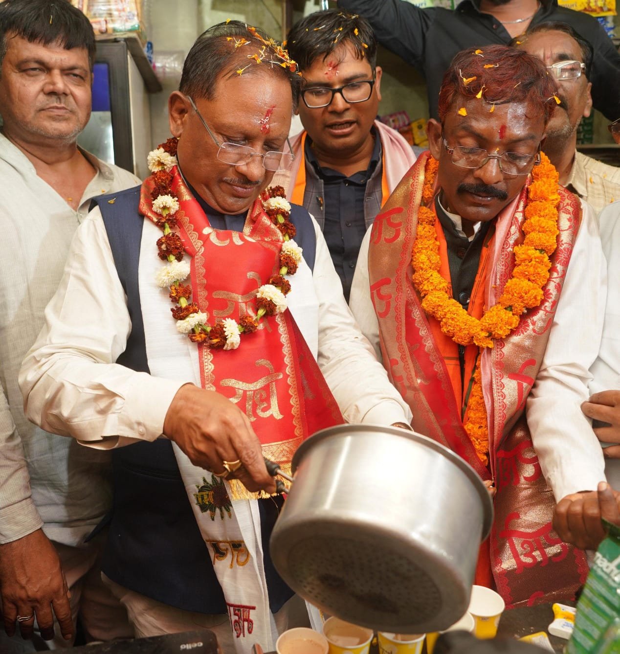 महापौर प्रत्याशी जीवर्धन चौहान की चाय दुकान पहुंचे सीएम विष्णु देव साय, खुद बनाई चाय, बोले – “चाय से ज्यादा मीठी जीवर्धन भाई की जुबान”