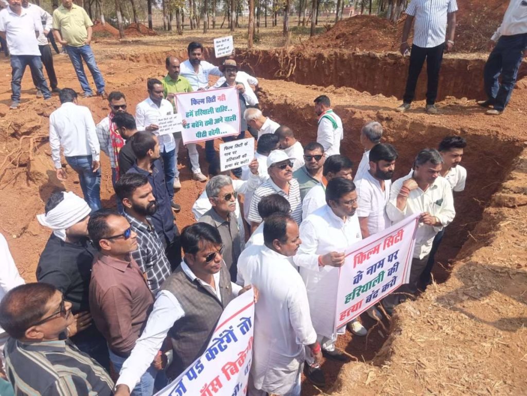 रायपुर। राजधानी रायपुर के नवा रायपुर स्थित तूता क्षेत्र में प्रस्तावित चित्रोत्पला फिल्म सिटी के निर्माण को लेकर विरोध तेज हो गया है। फिल्म सिटी के लिए करीब 1500 पेड़ों की कटाई के निर्णय के खिलाफ कांग्रेस ने बुधवार को अनोखा प्रदर्शन किया। पर्यावरण संरक्षण की मांग को लेकर कांग्रेस नेता और कार्यकर्ता निर्माण स्थल पर खोदे गए गड्ढों में उतर गए और सरकार के फैसले के खिलाफ जमकर नारेबाजी की।