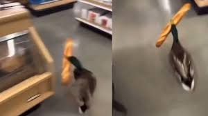 वायरल वीडियो में देखा जा सकताहै कि एक सुपर मार्केट में अचानक एक बत्तख घुस जाती है। बत्तख सीधे फूड सेक्शन की तरफ जाती है और वहां रखे हॉट डॉग में से एक उठा लेती है। फिर वह वहां से वैसे भागती है, जैसे उसे कोई पकड़ न ले।