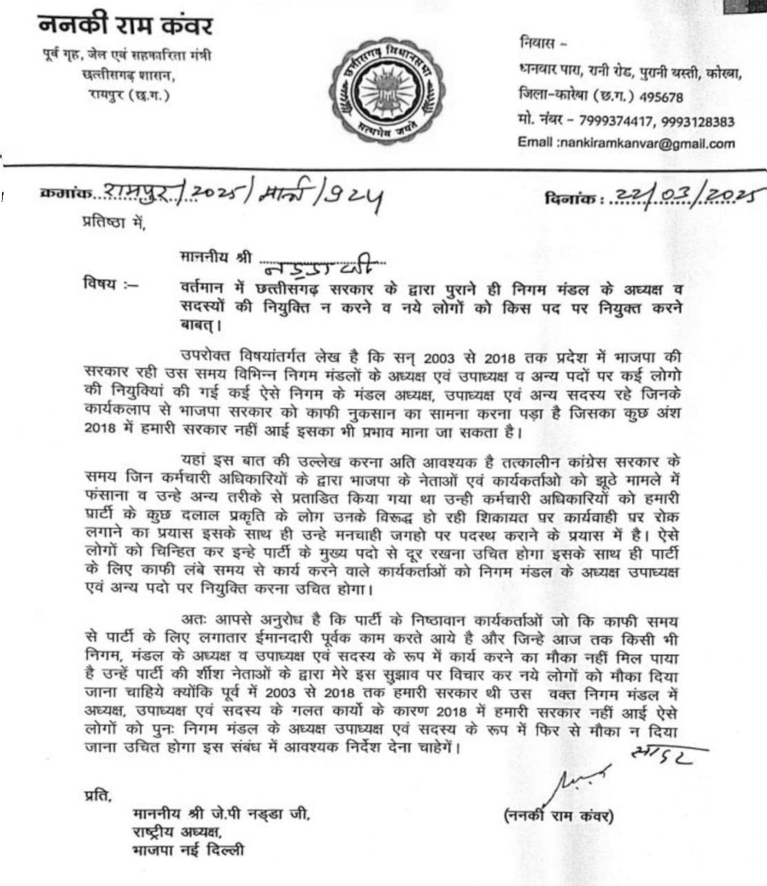 पूर्व मंत्री ननकीराम ने निगम-मंडलों की नियुक्ति को लेकर भाजपा अध्यक्ष नड्डा को लिखा पत्र…