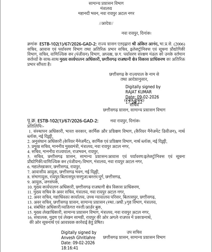 रायपुर। छत्तीसगढ़ सरकार के सामान्य प्रशासन विभाग (GAD) ने एकल आदेश जारी कर वरिष्ठ आईएएस अधिकारी अंकित आनंद को अतिरिक्त जिम्मेदारी सौंपी है। जारी आदेश के अनुसार उन्हें उनके वर्तमान दायित्वों के साथ छत्तीसगढ़ राजधानी क्षेत्र विकास प्राधिकरण (CRDA) का मुख्य कार्यपालन अधिकारी (CEO) का अतिरिक्त प्रभार दिया गया है।