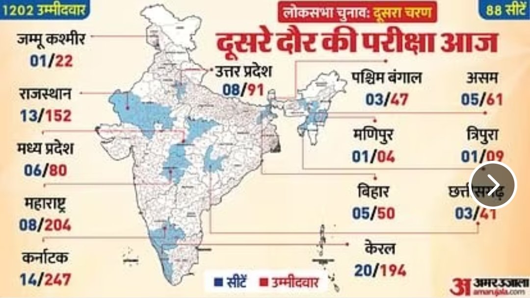 12 राज्यों और एक केंद्र शासित प्रदेश की 88 लोकसभा सीटों पर शुक्रवार को मतदान हो रहा है। दूसरे चरण के इस मतदान के लिए कुल 1202 उम्मीदवार चुनाव मैदान में हैं। इन 88 लोकसभा सीटों में मणिपुर की बाहरी मणिपुर लोकसभा सीट भी शामिल है, जहां पहले चरण में भी वोट डाला गया था। बाहरी मणिपुर की 15 विधानसभा सीटों पर पहले चरण में मतदान हुआ था। जबकि, 13 अन्य सीटों पर शुक्रवार को वोटिंग हो रही है।