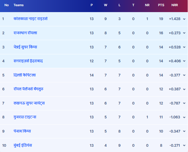 वहीं दूसरे स्थान के लिए अब राजस्थान रॉयल्स और सनराइजर्स हैदराबाद के बीच जंग देखने को मिल सकती है. राजस्थान अगर अपना आखिरी मैच जीतती है तो वह अधिकतम 18 अंकों तक पहुंच सकती है. जबकि सनराइजर्स हैदराबाद भी अधिकतम 18 अंकों तक पहुंच सकती है. हैदराबाद के अभी दो मैच बचे हैं और वह 14 अंकों के साथ चौथे स्थान पर है. हैदराबाद अगर एक भी मैच हारती है तो दूसरे स्थान राजस्थान रहेगी या हैदराबाद इसका फैसला नेट रन रेट के आधार पर होगा. बता दें, टॉप-2 में फिनिश करने वाली टीमों के पास फाइनल में पहुंचने के दो मौके होंगे. ऐसे में राजस्थान और हैदराबाद की कोशिश होगी कि वह दूसरे स्थान पर फिनिश करें.