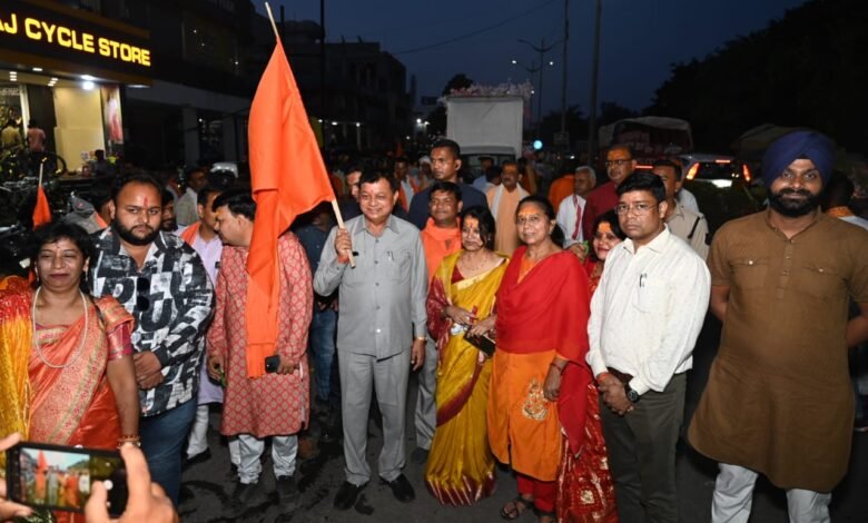भगवा ध्वज लेकर रामनवमी के शोभायात्रा में शामिल हुए मंत्री लखन लाल देवांगन : भगवान श्री राम की झांकी की उतारी आरती, लिया आशीर्वाद