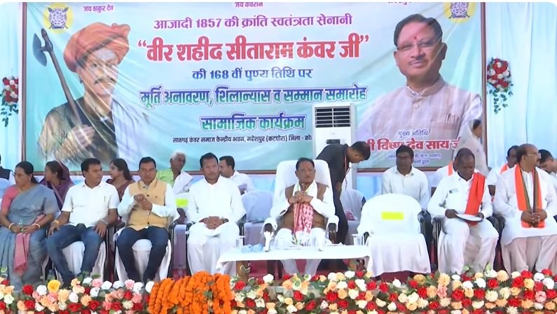 कोरबा। आजादी के 1857 की क्रांति स्वतंत्रता सेनानी “वीर शहीद सीताराम कंवर जी” की 168वीं पुण्यतिथि पर कटघोरा के महेशपुर स्थित सातगढ़ कंवर समाज केंद्रीय भवन में मूर्ति अनावरण, शिलान्यास और सम्मान समारोह का आयोजन हुआ। इस मौके पर मुख्यमंत्री विष्णुदेव साय मुख्य अतिथि के रूप में शामिल हुए और कई महत्वपूर्ण घोषणाएं कीं।