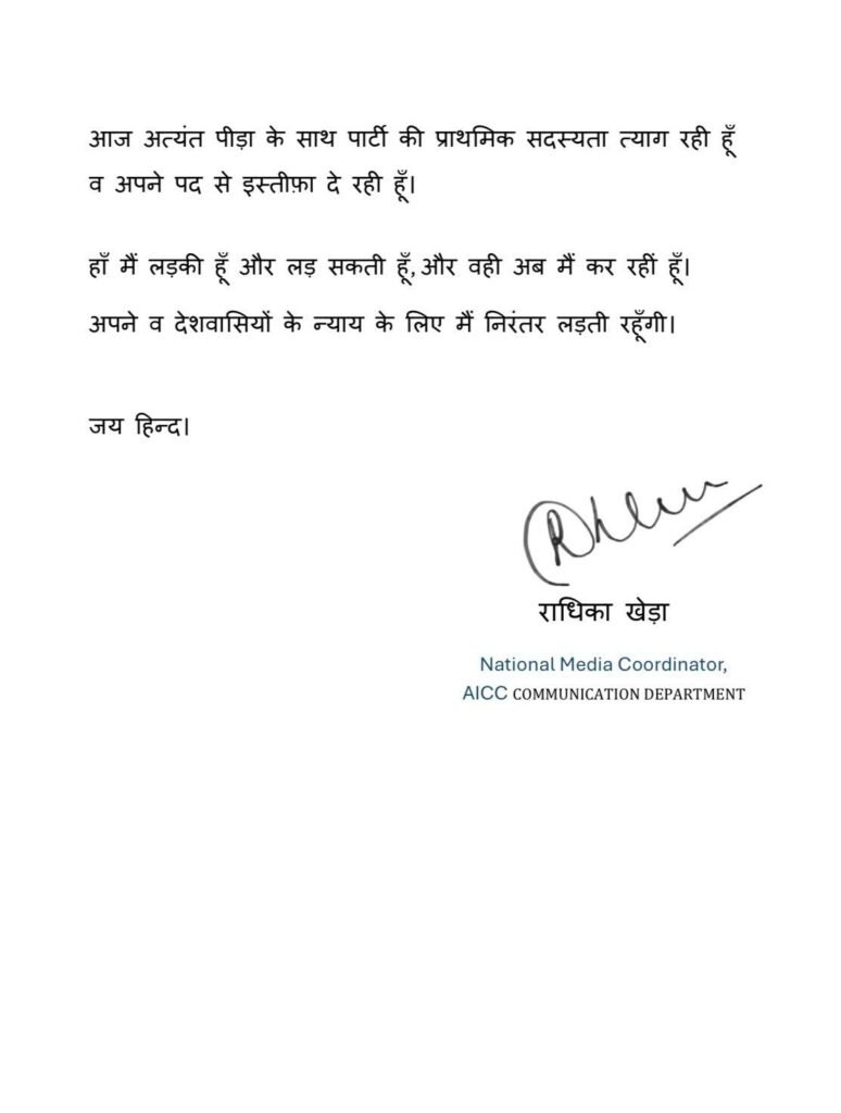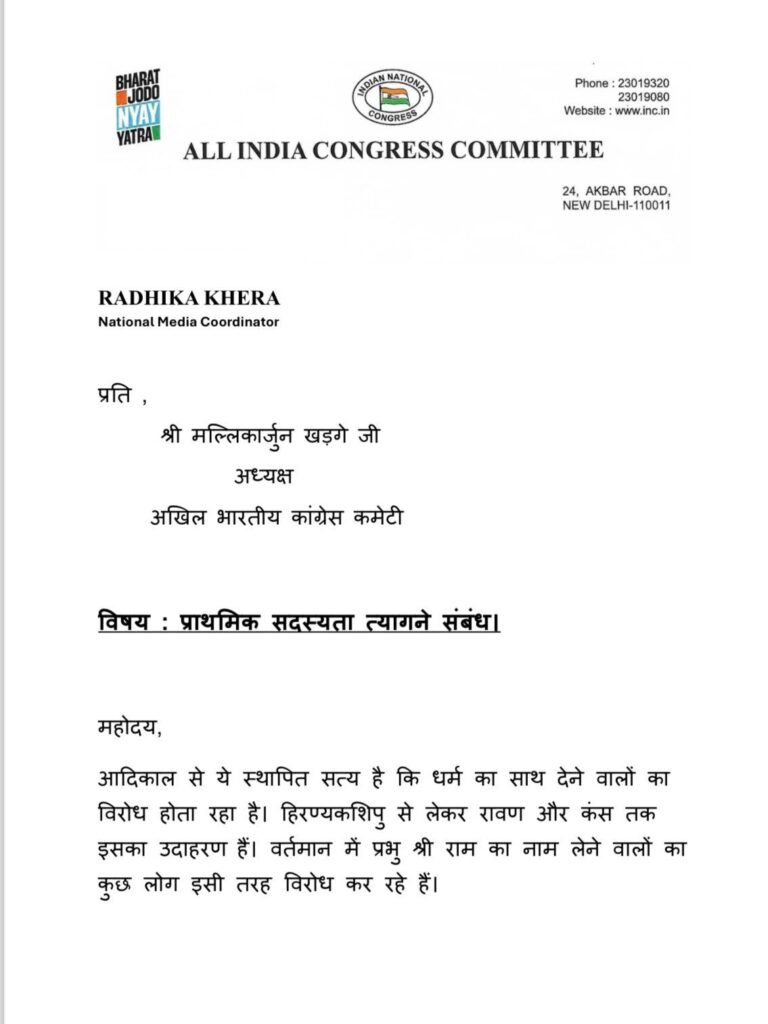 राधिका खेड़ा ने भेजा अपना त्यागपत्र : कांग्रेस की प्राथमिक सदस्यता से दिया इस्तीफा, पत्र में लिखा – ‘मेरा अयोध्या में प्रभु श्री राम का दर्शन करना पार्टी के नेताओं को ठीक नहीं लगा…. ‘