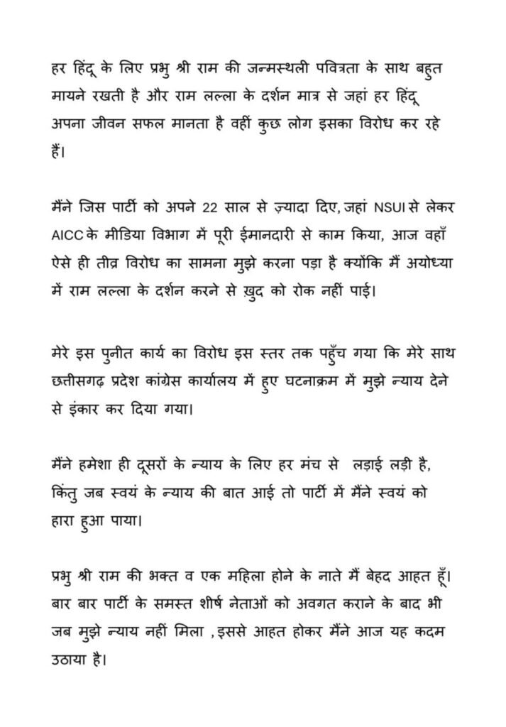 छत्तीसगढ़ के प्रदेश कांग्रेस कार्यालय में राधिका खेड़ा के साथ हुए कथित छेड़खानी के बाद अब राधिका खेड़ा ने कांग्रेस पार्टी से अपना इस्तीफा दे दिया है । अपने तीन पन्ने के इस्तीफा पत्र में राधिका खेड़ा ने पार्टी के नेताओं पर कई गंभीर आरोप भी लगाए हैं । राधिका खेड़ा ने पत्र में लिखा है अयोध्या जाकर प्रभु श्री राम का मंदिर का दर्शन करना मेरे पार्टी के कई नेताओं को रास नहीं आया साथ ही राधिका खेड़ा ने अपने साथ हुए दुर्व्यवहार का न्याय नहीं मिलने की बात कही है ।