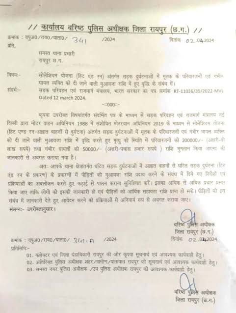 रायपुर SSP ने थाना प्रभारियों को जारी किया आदेश : हिट एंड रन मामलों में मृतक और घायलों को दी जाने वाले मुआवजे में बड़ी वृद्धि