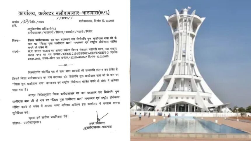 रायपुर :- छत्तीसगढ़ सरकार ने बलौदाबाजार जिले का नाम बदलने का फैसला लिया है। अब यह जिला संत शिरोमणि गुरु घासीदास बाबा जी के नाम पर “गुरु घासीदास धाम” कहलाएगा। इसके साथ ही, इसे राष्ट्रीय तीर्थस्थल भी घोषित किया जाएगा। इसके साथ ही, छत्तीसगढ़ सरकार इस क्षेत्र को राष्ट्रीय तीर्थस्थल के रूप में भी घोषित कर सकती है। अपर कलेक्टर को जारी आदेश में अधिकारियों से इस फैसले पर स्पष्ट राय देने को कहा गया है। प्रशासन से जल्द से जल्द आवश्यक औपचारिकताएं पूरी करने के निर्देश दिए गए हैं।