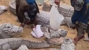 वायरल वीडियो में शुरुआत में कुछ साफ नजर नहीं आता है, लेकिन कुछ सेकेंड बाद ऐसा कुछ दिखता है, जिसकी किसी ने कल्पना नहीं की होगी। दरअसल, एक आदमी बहुत सारे मगरमच्छों के बीच में खड़ा है और वो उन्हें मांस खिला रहा है।