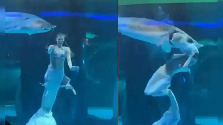 चौंका देने वाले इस वायरल वीडियो में देखा जा सकता है कि, महिला पानी के अंदर डांस कर ही रही होती है. इस दौरान एक मछली उसका सिर निगलने की कोशिश करने लगती है, जिसका वीडियो इन दिनों सोशल मीडिया यूजर्स के होश उड़ा रहा है. सोशल मीडिया पर इन दिनों एक चौंकाने वाला वीडियो तेजी से वायरल हो रहा है, जिसमें एक विशाल मछली ने एक ‘जलपरी परफॉर्मर’ (mermaid performer) के सिर पर हमला कर दिया. यह खौफनाक घटना चीन के Xishuangbanna Primitive Forest Park में हुई, जहां 22 वर्षीय रूसी परफॉर्मर माशा (Masha) एक्वेरियम (aquarium tank) के अंदर जलपरी की पोशाक में परफॉर्म कर रही थीं.