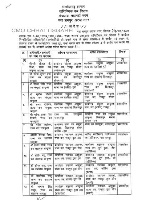 वाणिज्यिक कर-जी.एस.टी. विभाग में पदस्थ संयक्त आयुक्त राज्य कर के 05, राज्य कर उपायुक्त के 02, सहायक आयुक्त राज्य कर के 12,  एक राज्य कर अधिकारी एवं एक निरीक्षक राज्य कर सहित 21 अधिकारी/कर्मचारियों के आदेश राज्य कर आयुक्त कार्यालय ने जारी किए हैं।