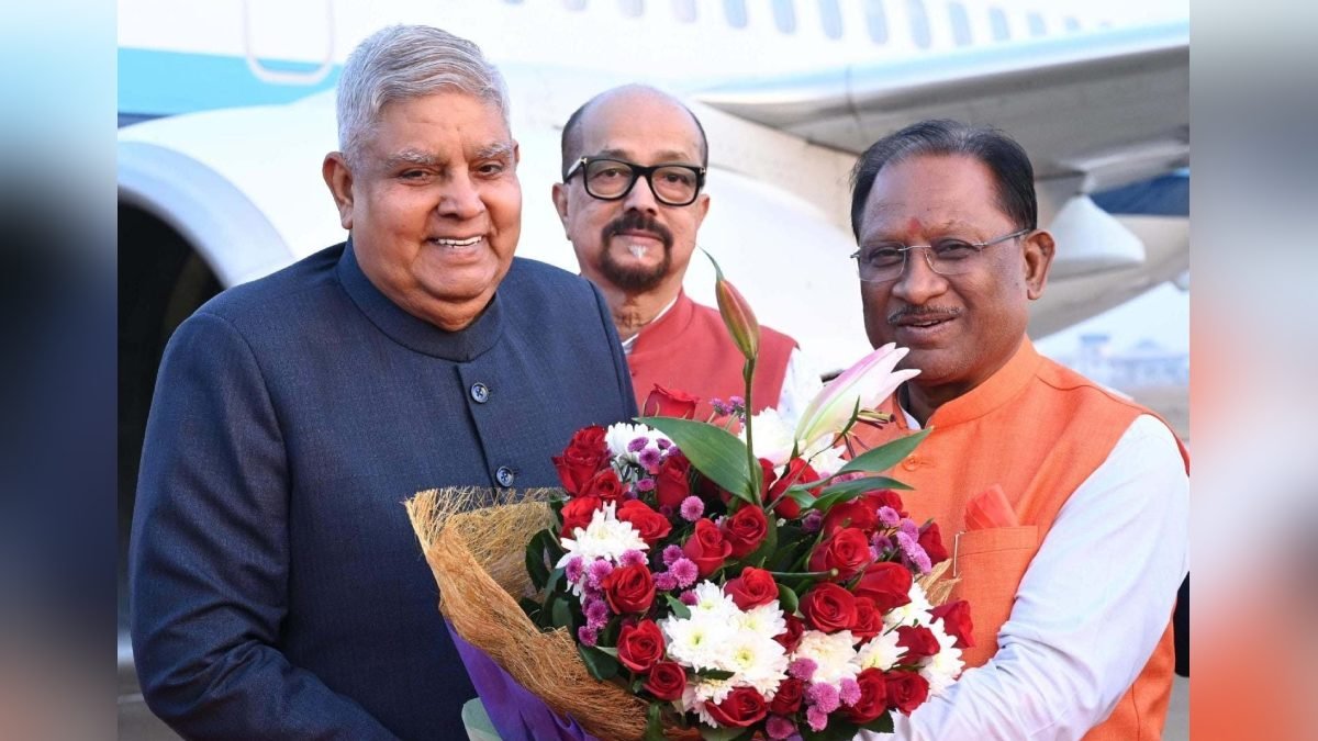 रायपुर. भारत के उपराष्ट्रपति जगदीप धनखड़ के रायपुर आगमन पर राज्यपाल रमेन डेका और मुख्यमंत्री विष्णुदेव साय  ने स्वामी विवेकानंद विमानतल में पुष्प गुच्छ भेंट कर उनका आत्मीय स्वागत किया.